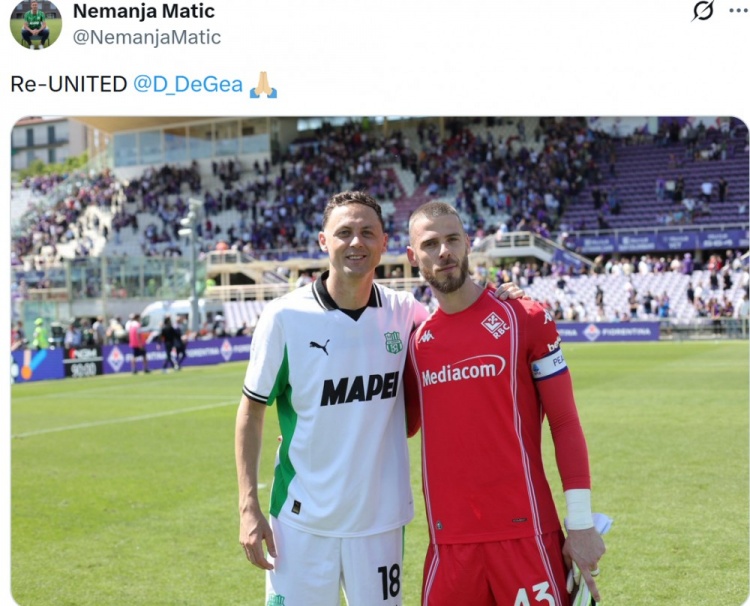 4月27日讯 意甲第34轮比赛,萨索洛在客场以0-0的比分战平佛罗伦萨。本场比赛,两名前曼联球员马蒂奇和德赫亚在场上交手,但显然两人有着不错的友谊。
